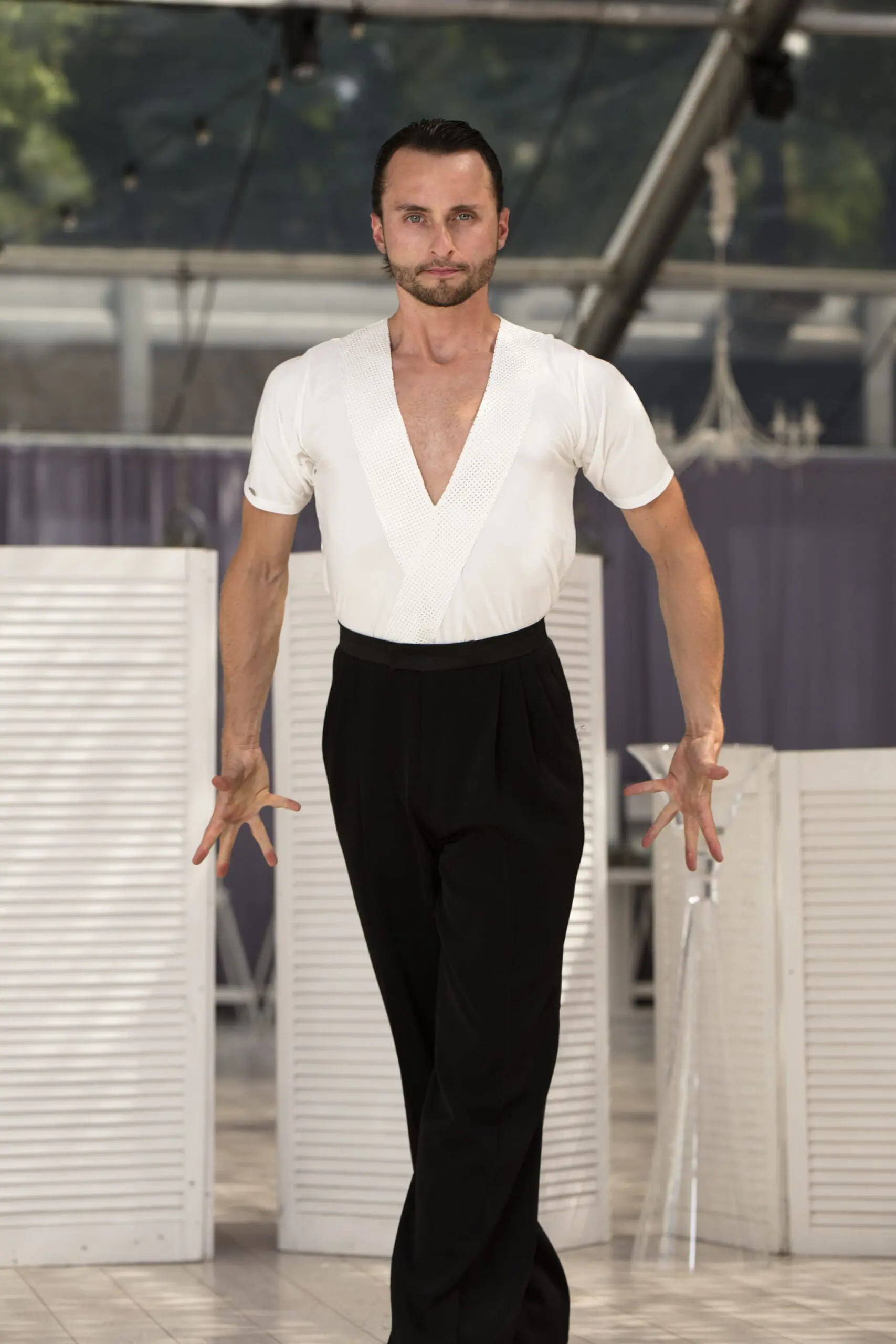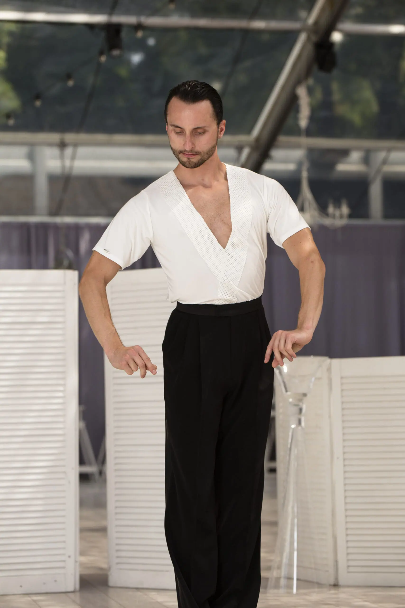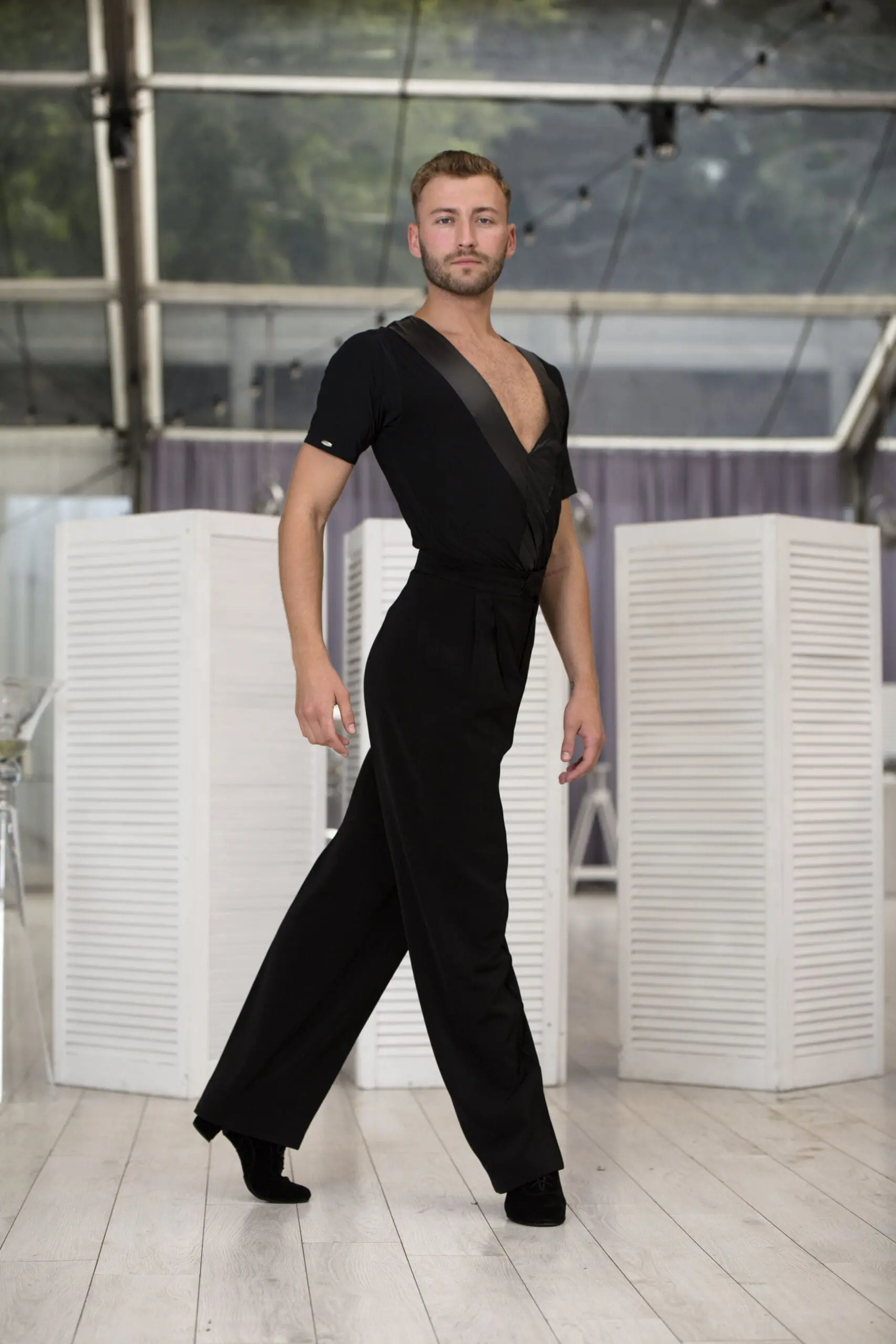 The Diran blouse is our proposition for both training and everyday outings. The deep neckline of the t-shirt finished with ecological leather beautifully highlights the dancer’s chest. It is made of the highest quality materials, which makes it very comfortable and airy. The Diran blouse looks best tucked into pants, but you can also wear it outside. Available in two colors: ecru and black.