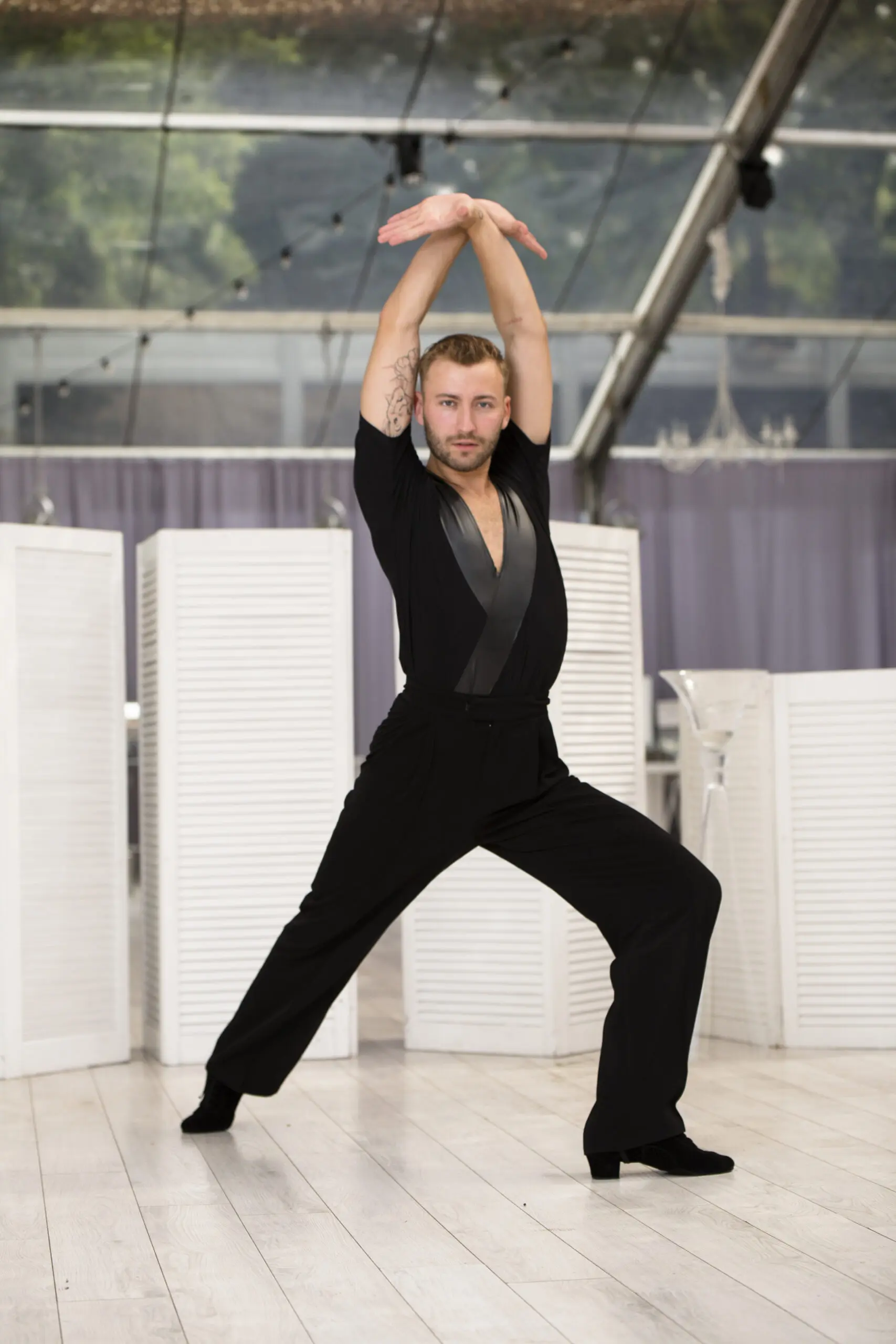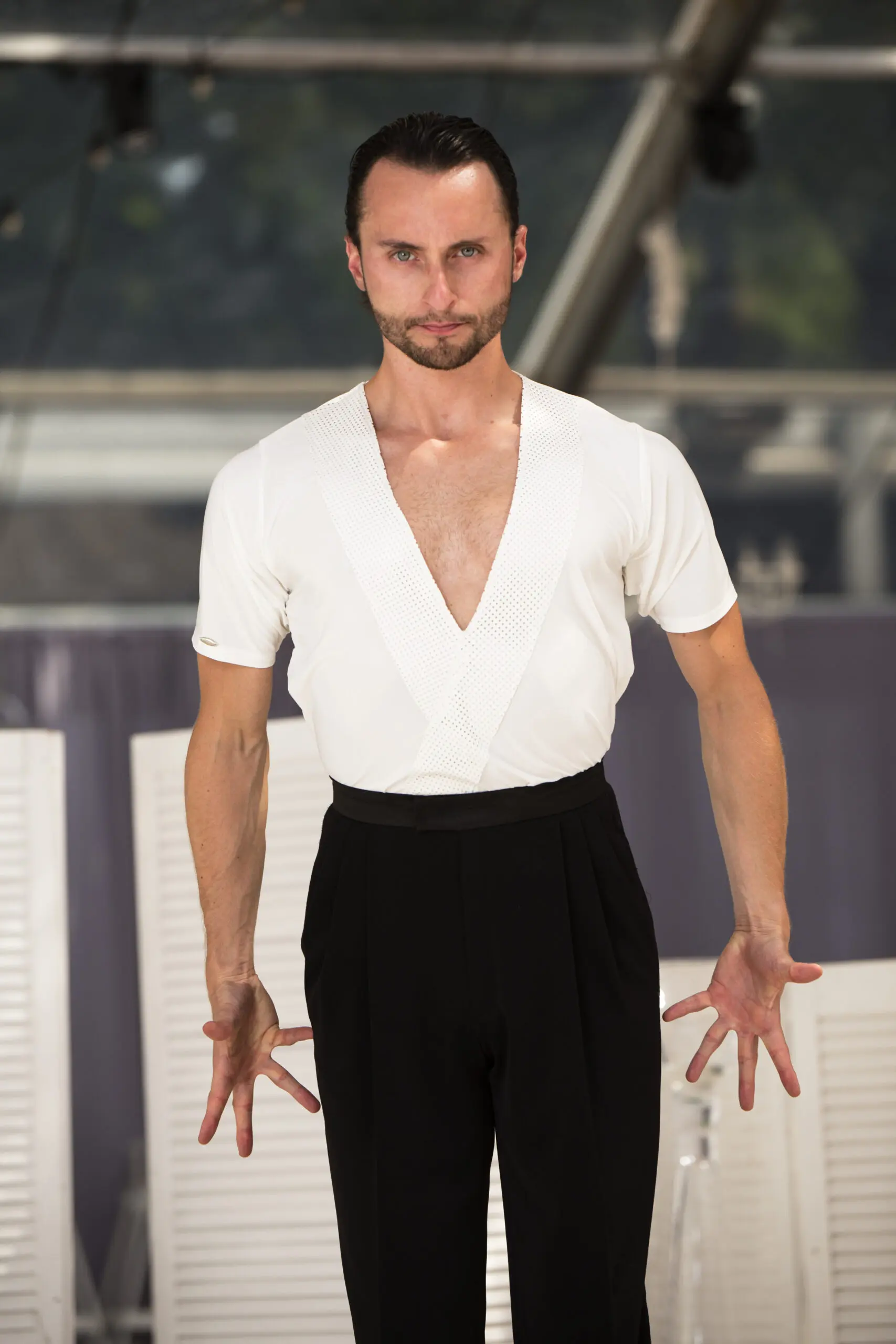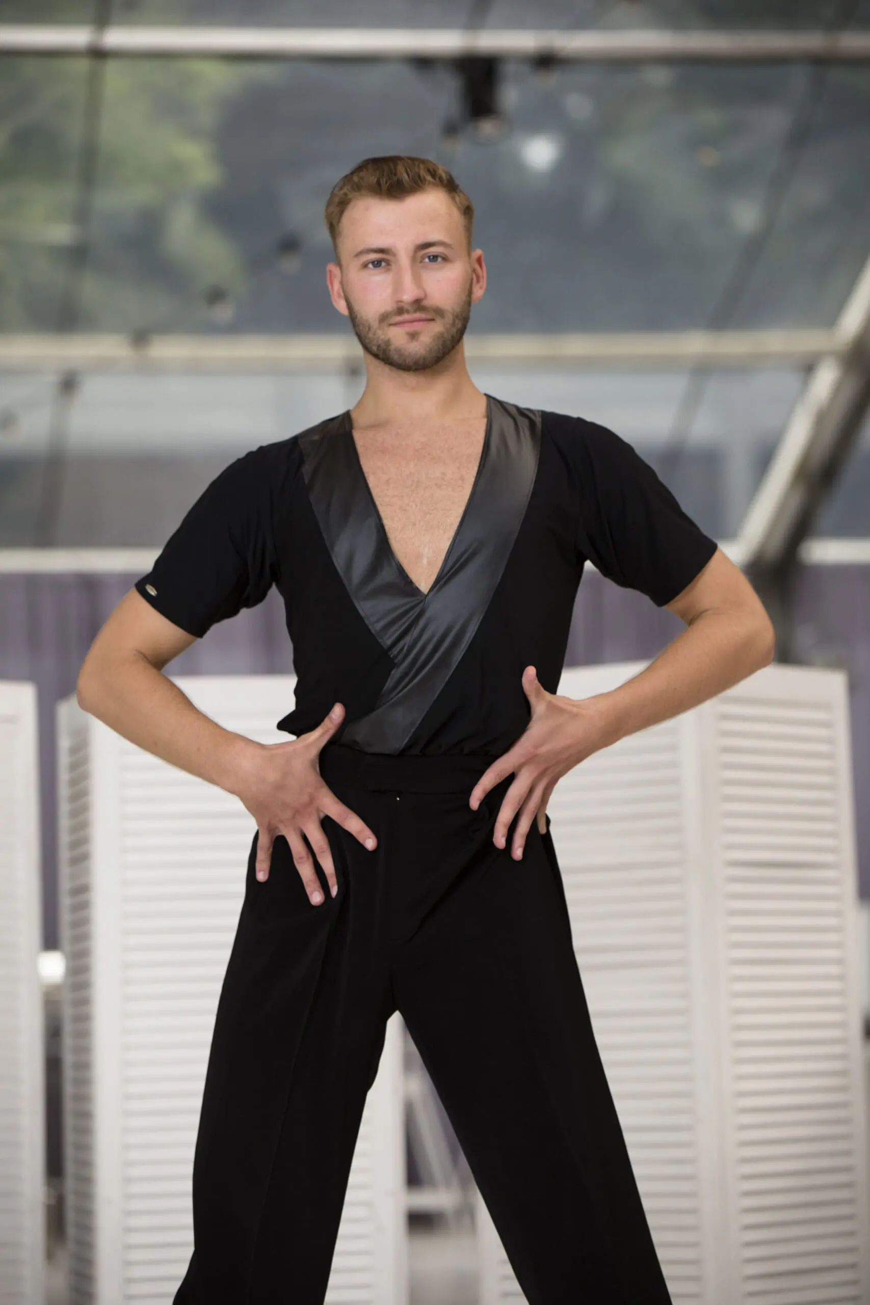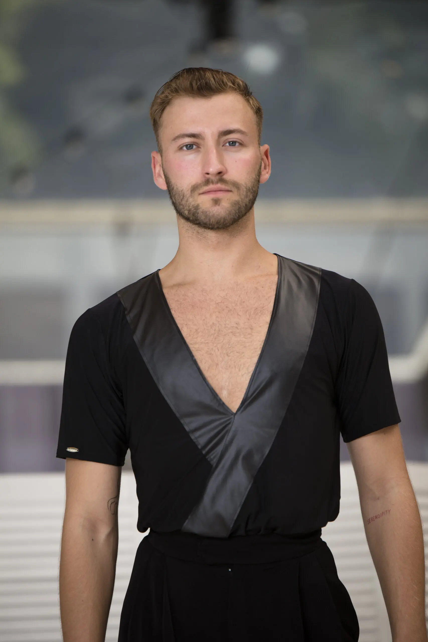 The Diran blouse is our proposition for both training and everyday outings. The deep neckline of the t-shirt finished with ecological leather beautifully highlights the dancer’s chest. It is made of the highest quality materials, which makes it very comfortable and airy. The Diran blouse looks best tucked into pants, but you can also wear it outside. Available in two colors: ecru and black.