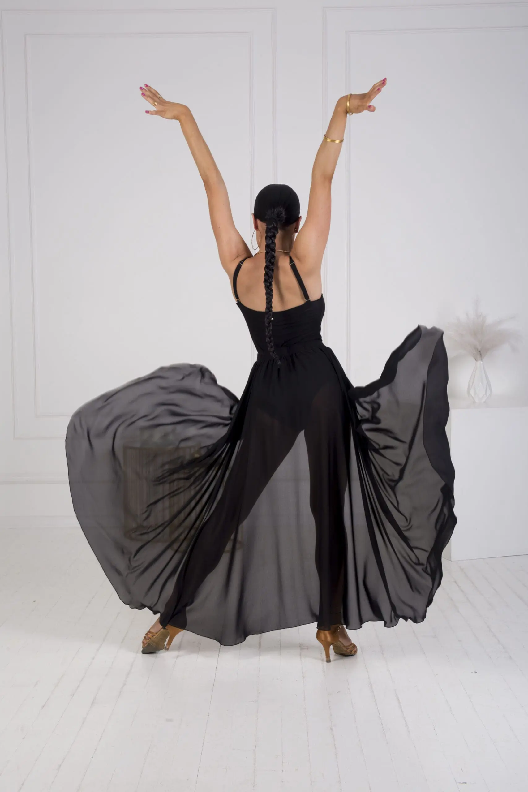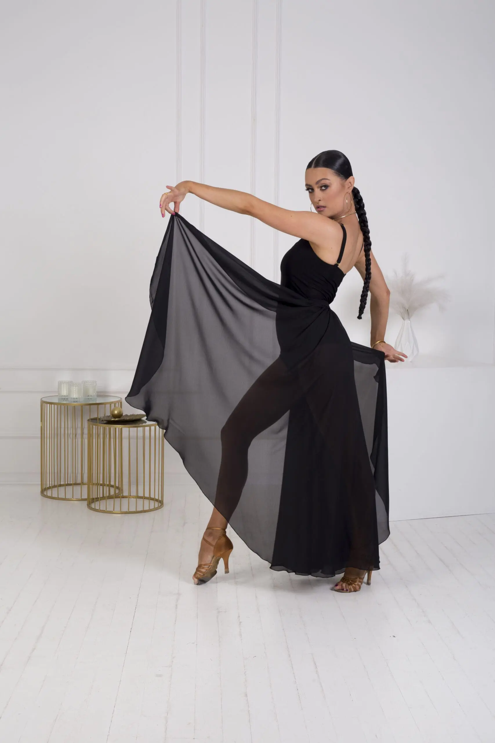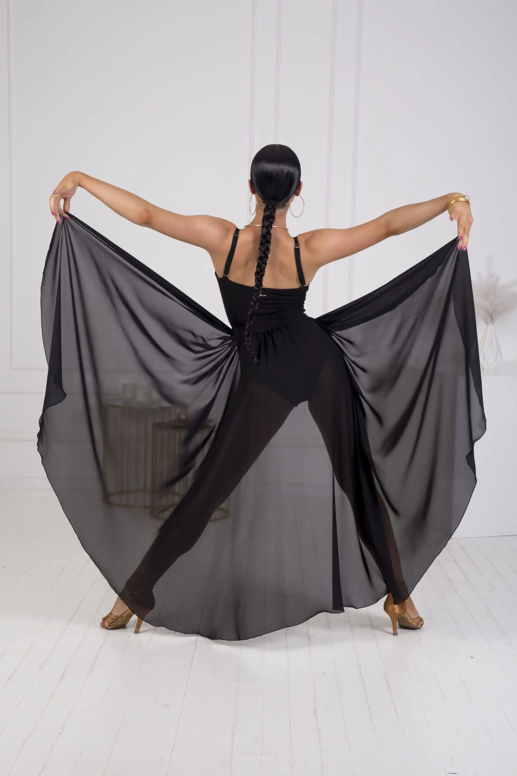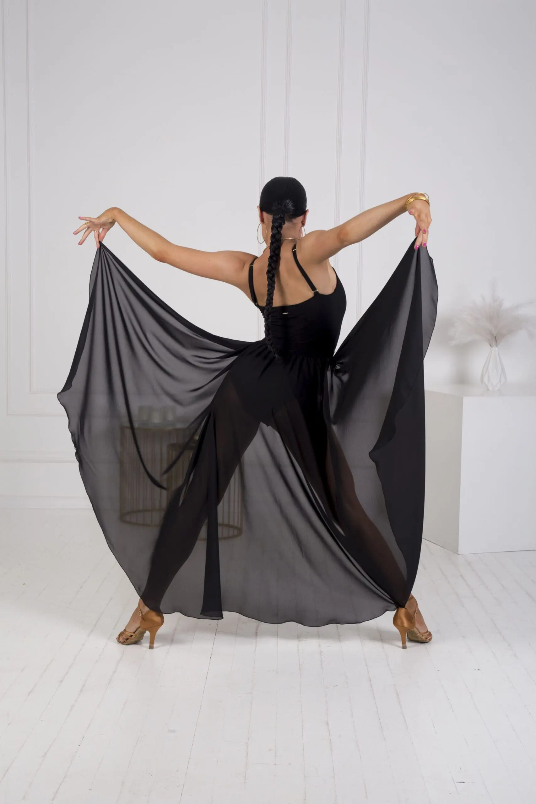 The long Isadora skirt is the essence of elegance and lightness, perfect for every dancer. Made of black chiffon, cut from a circle, so it drapes beautifully and swirls with every movement. It goes perfectly with a classic bodysuit IRIS, leggings, trousers and a classic skirt, creating extremely stylish and diverse sets. Perfect for standard and Latin American dances, it is an indispensable element of every dancer’s wardrobe, adding charm and class to every choreography.