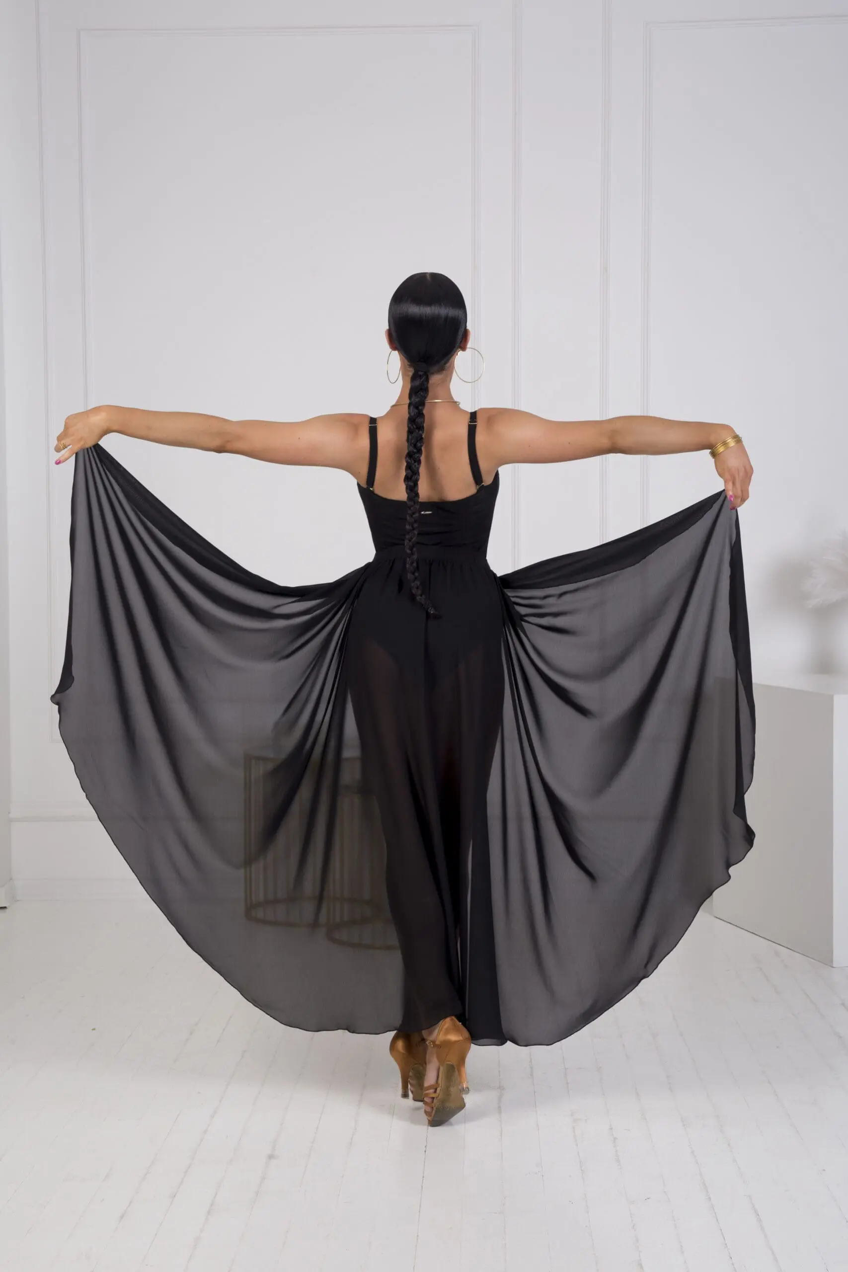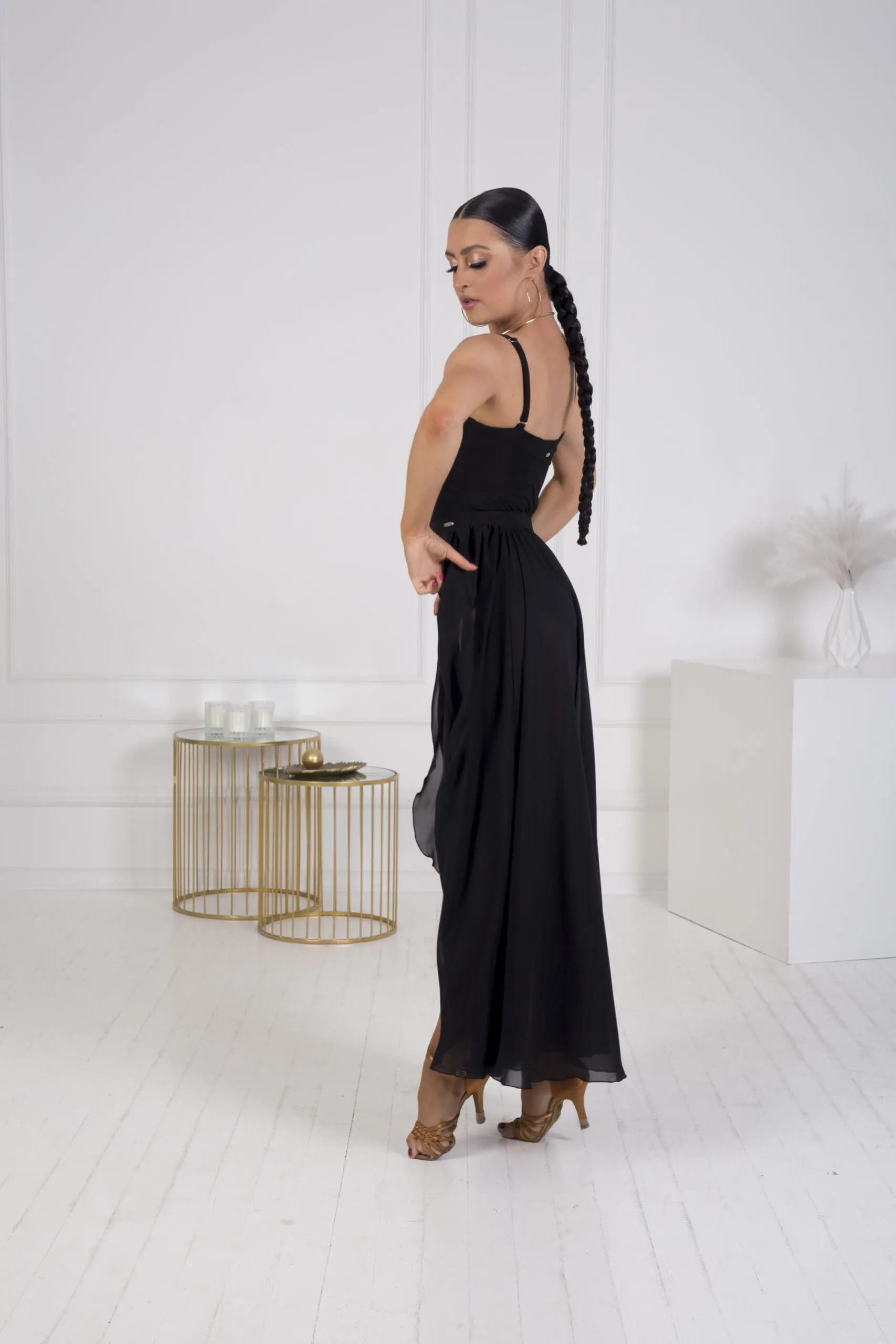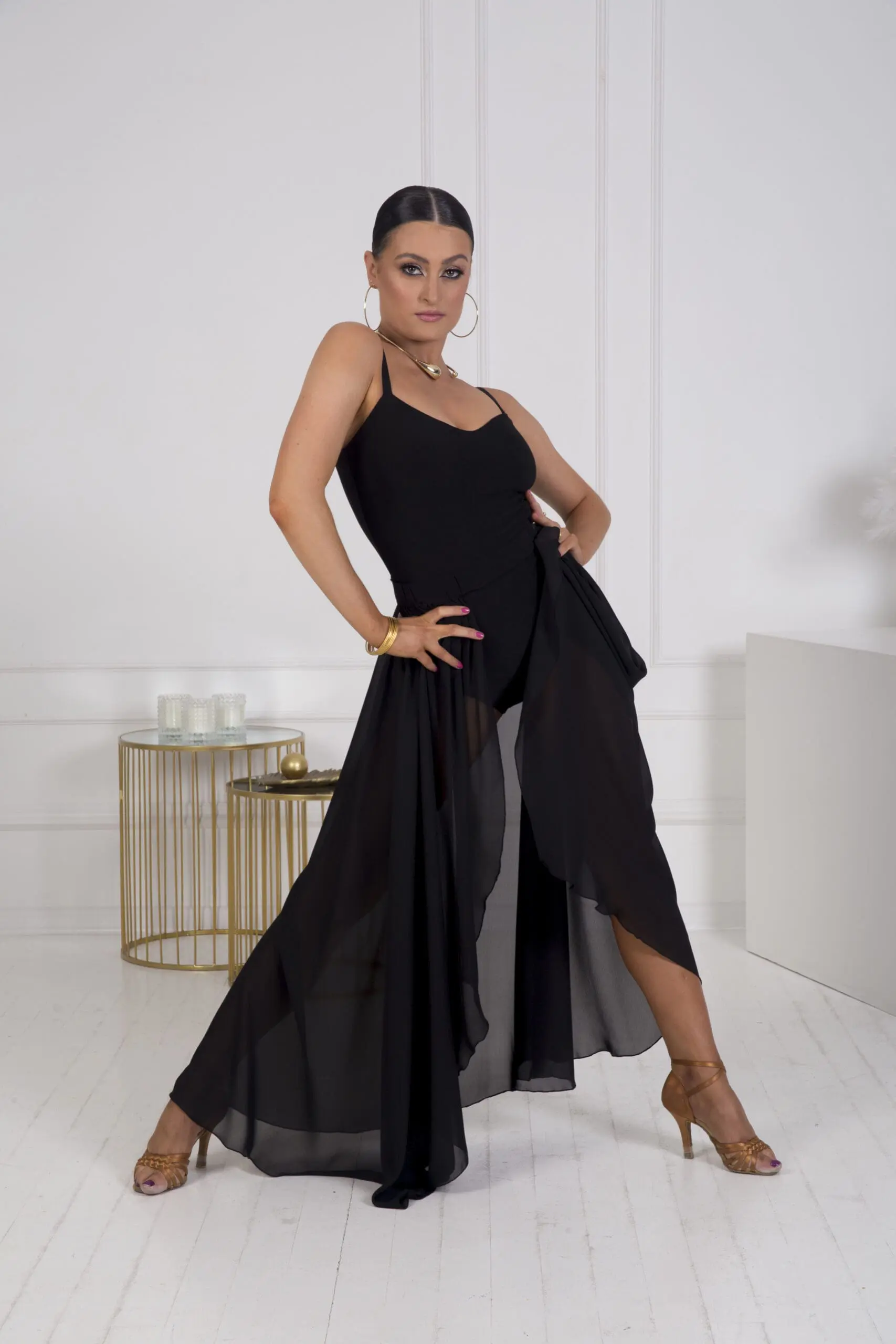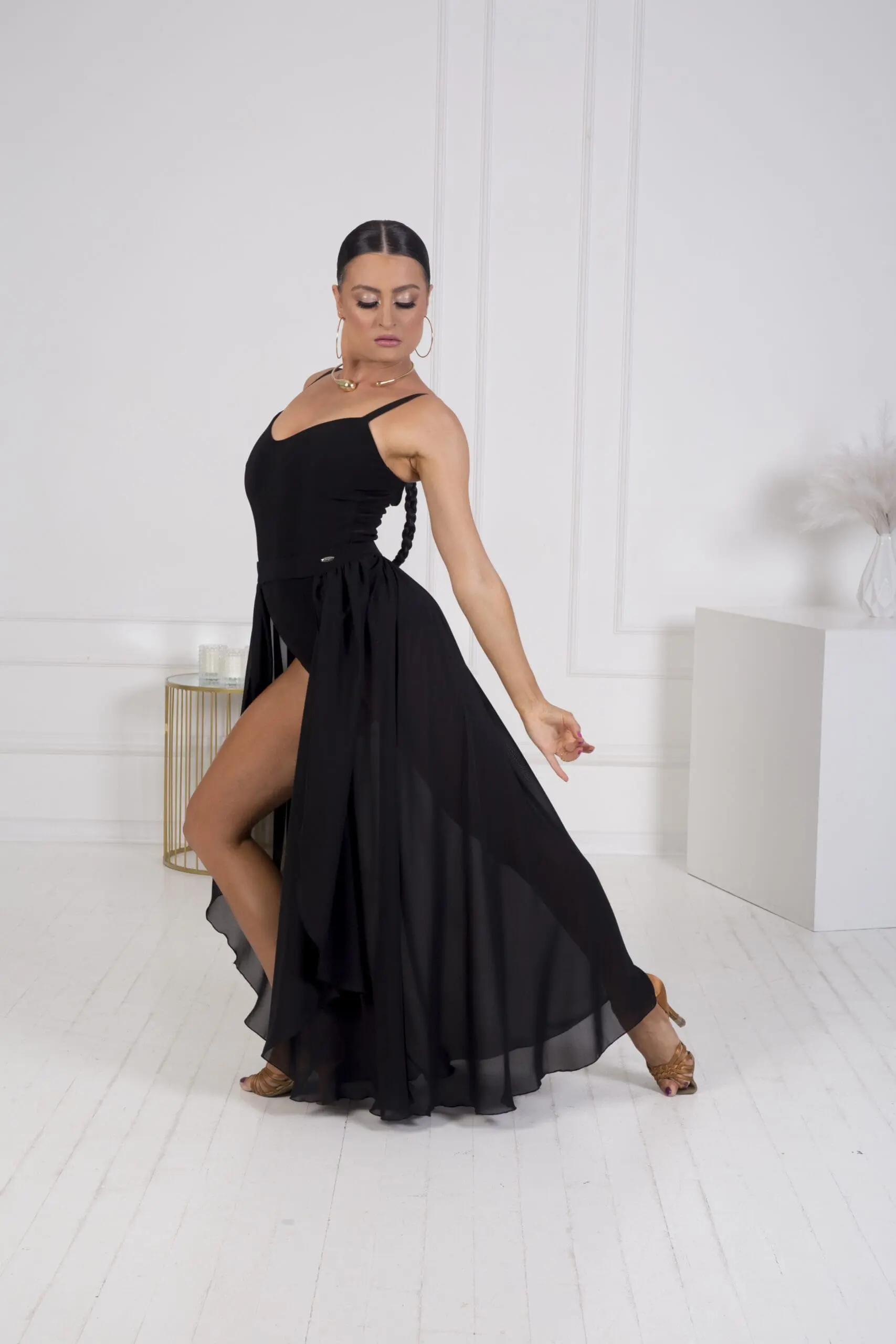 The long Isadora skirt is the essence of elegance and lightness, perfect for every dancer. Made of black chiffon, cut from a circle, so it drapes beautifully and swirls with every movement. It goes perfectly with a classic bodysuit IRIS, leggings, trousers and a classic skirt, creating extremely stylish and diverse sets. Perfect for standard and Latin American dances, it is an indispensable element of every dancer’s wardrobe, adding charm and class to every choreography.