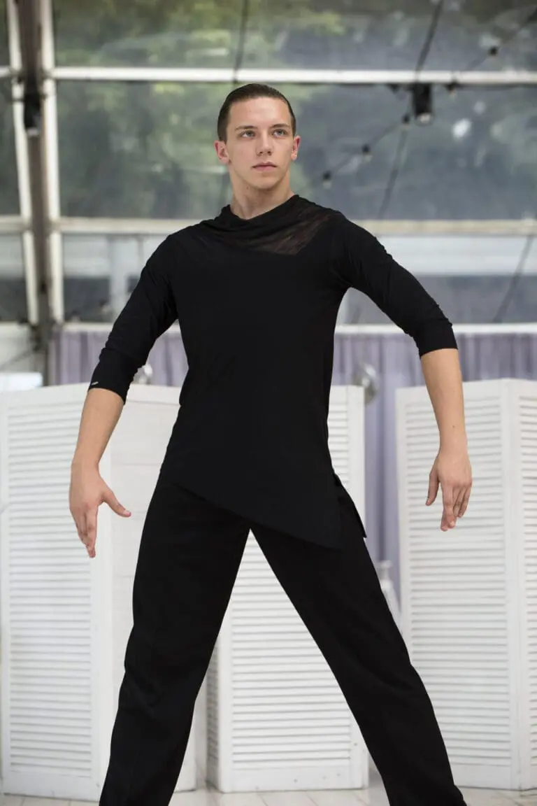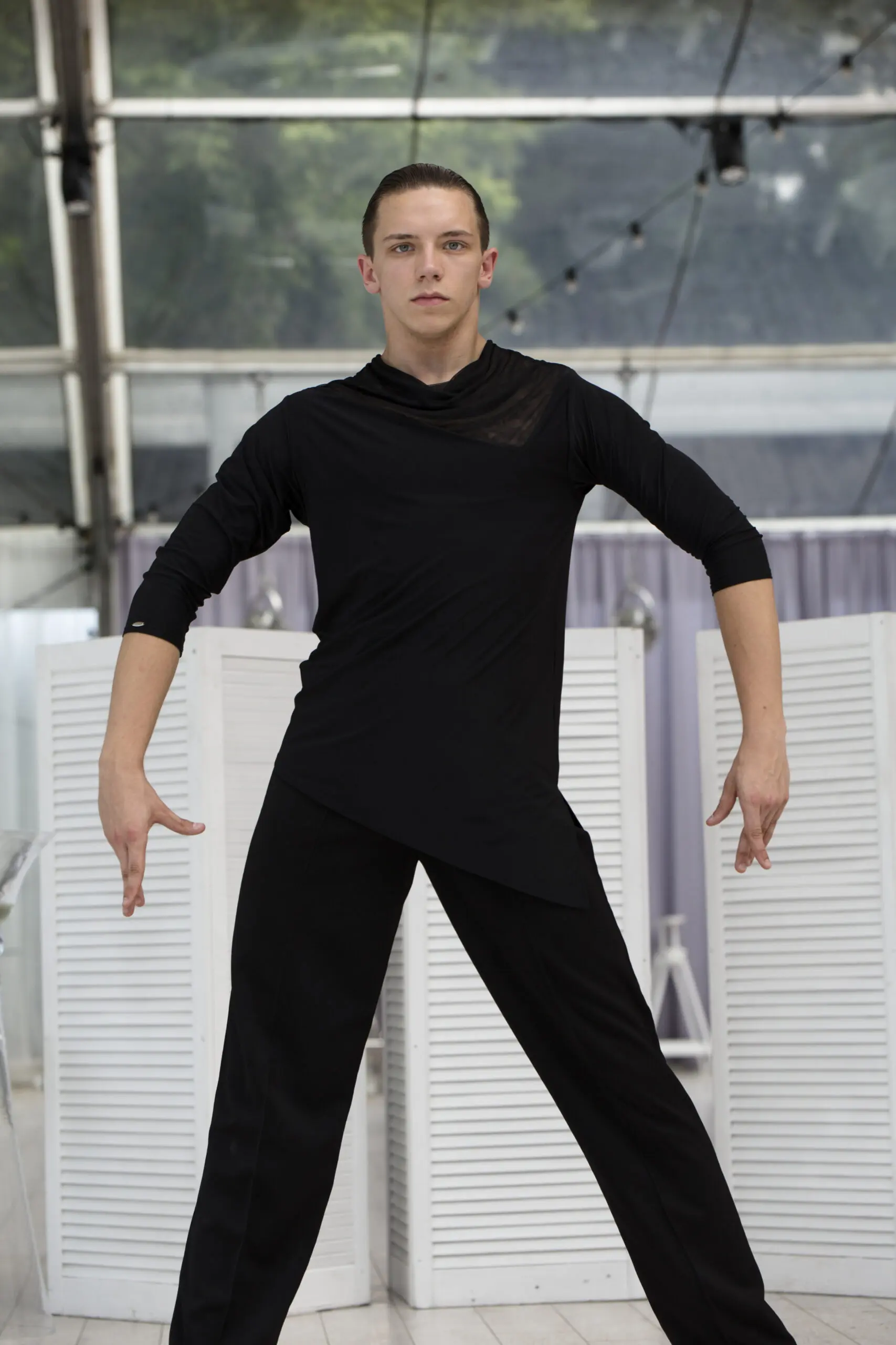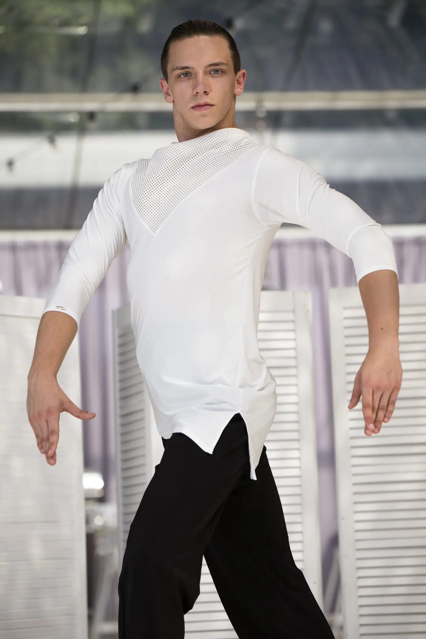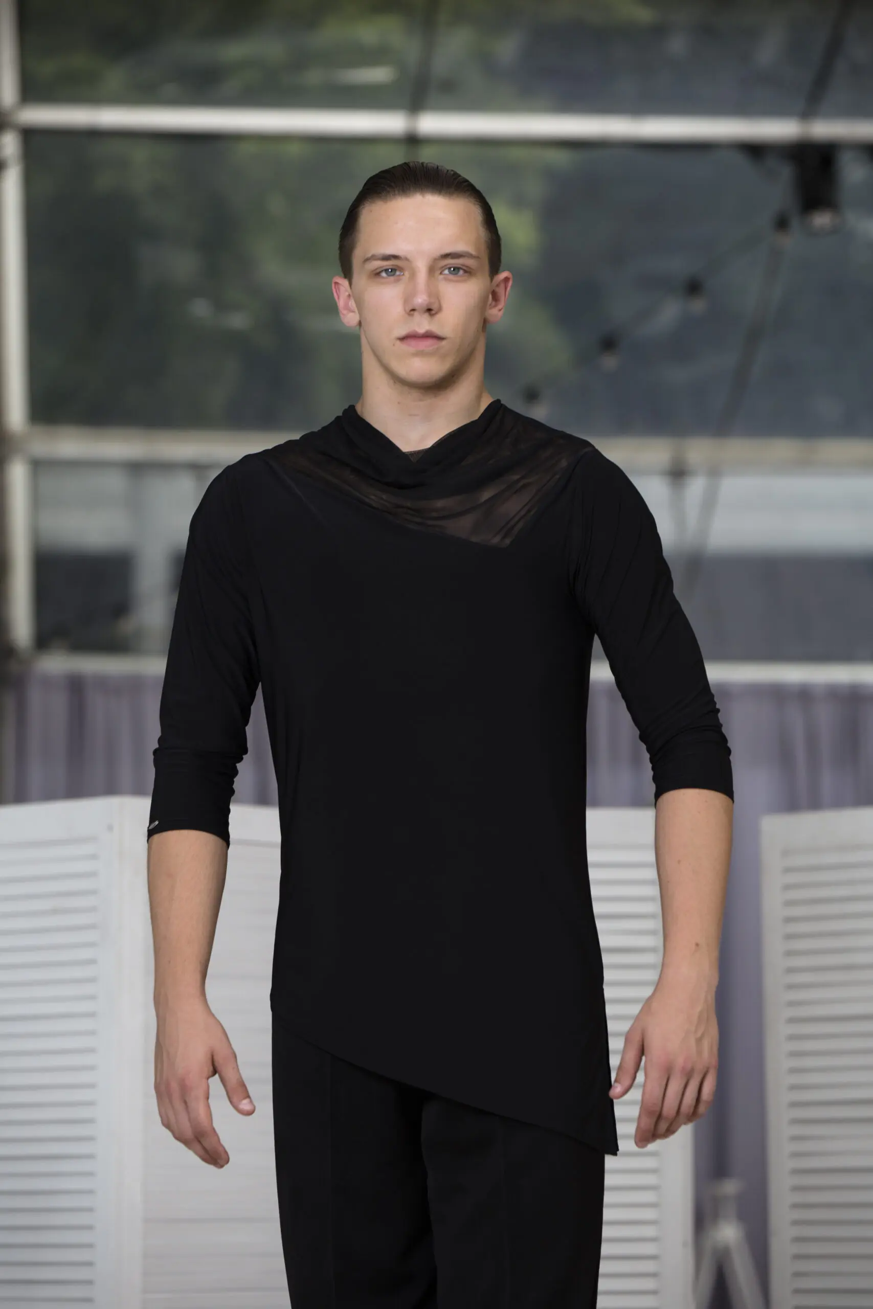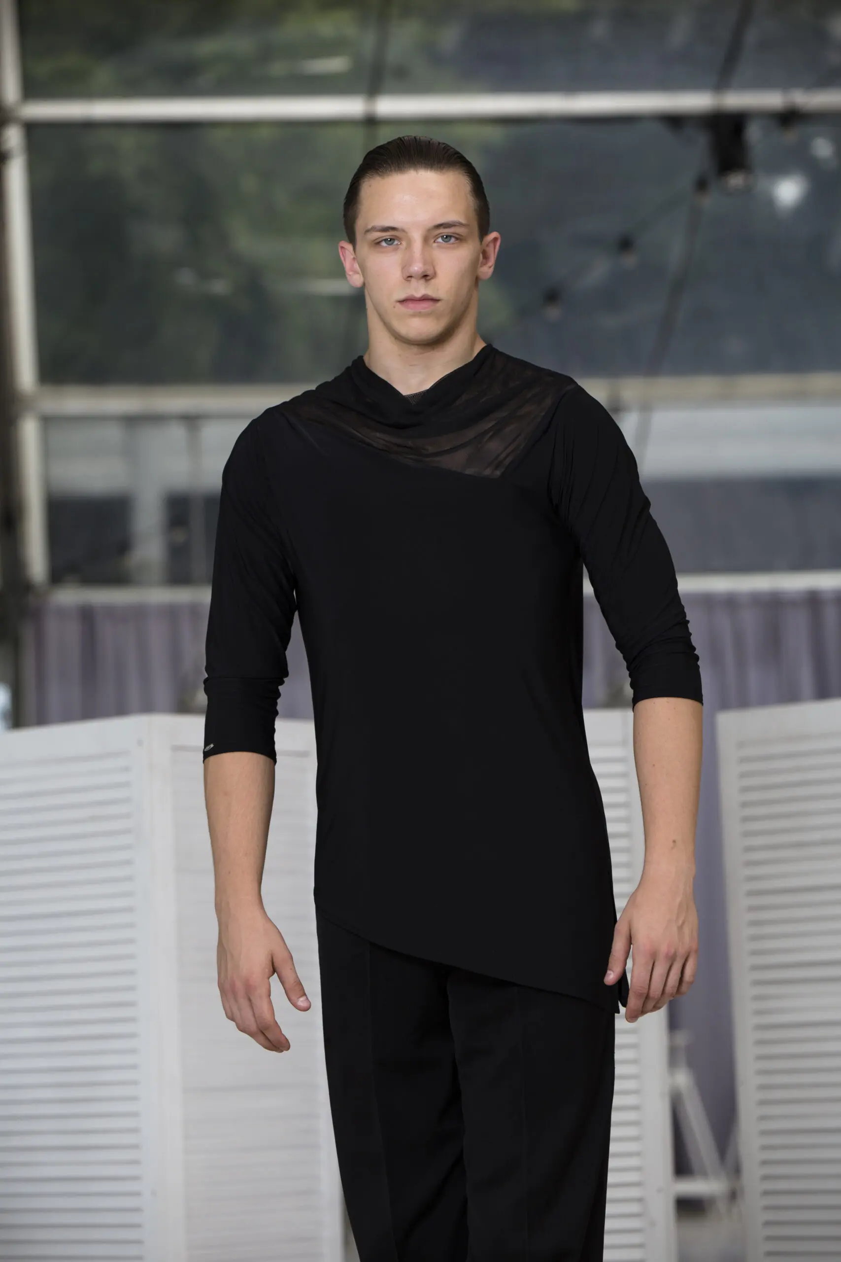 Kamet is our proposition for men who like less suited things. The blouse is available in two colors: ecru and black. The loose turtleneck of the cream-colored blouse is made of ecological leather, while in the black model it is made of mesh. The diagonal cut of the blouse with a side slit does not inhibit movement while dancing. The Kamet blouse is our offer for both training and everyday outings. It goes very well with jeans and dance pants.