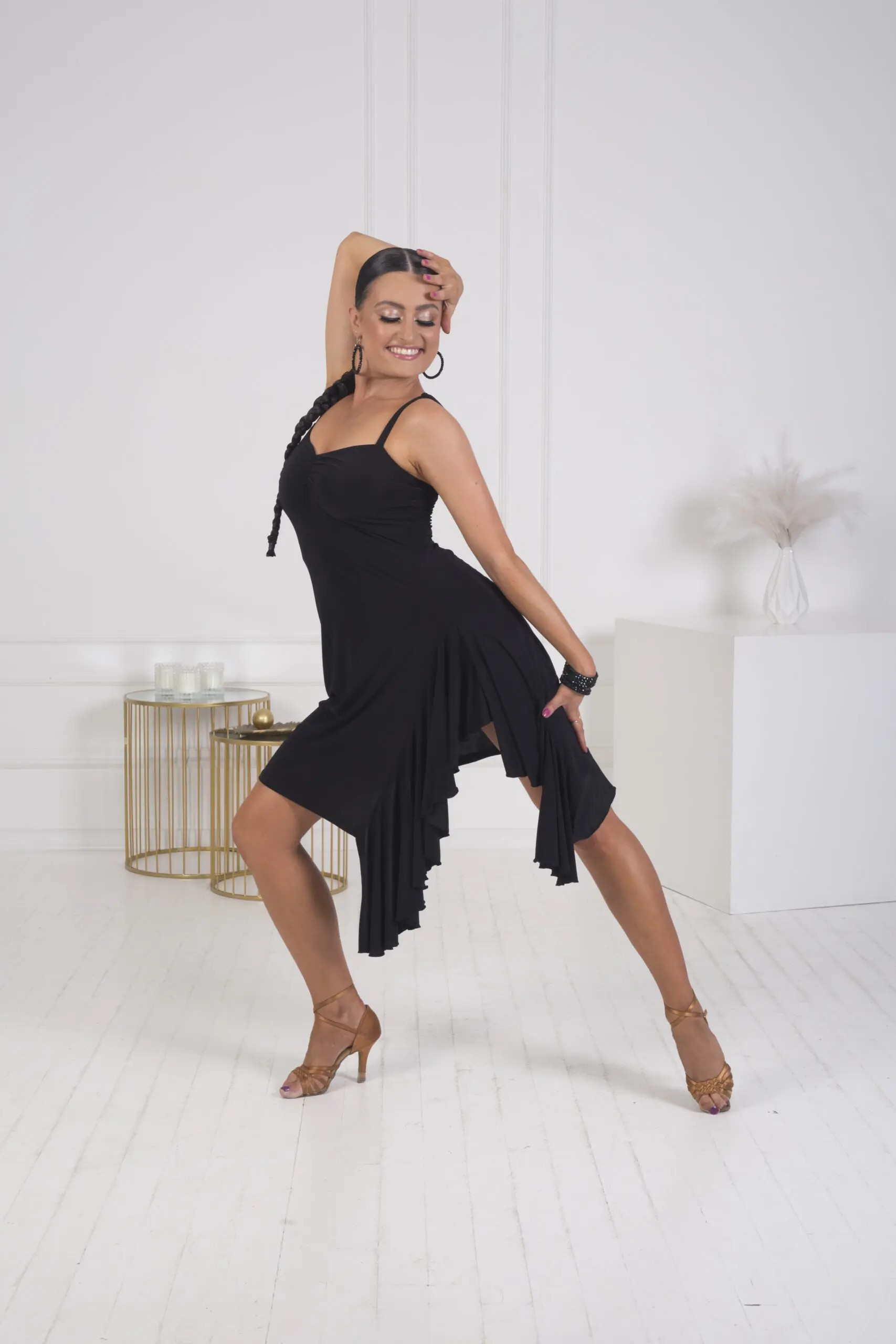 Odkryj swoją zmysłową stronę w naszej czarnej sukience Rock na regulowanych ramiączkach, stworzonej specjalnie z myślą o tańcach latynoamerykańskich. Sukienka ta zachwyca pięknym marszczonym dekoltem, który efektownie podkreśla biust, dodając elegancji i pewności siebie. Spódnica z falbanką na boku nie tylko przyciąga wzrok, ale także podkreśla każdy ruch, tworząc dynamiczny i uwodzicielski efekt na parkiecie. Idealny wybór dla każdej tancerki, która pragnie połączyć komfort z niezrównanym stylem.