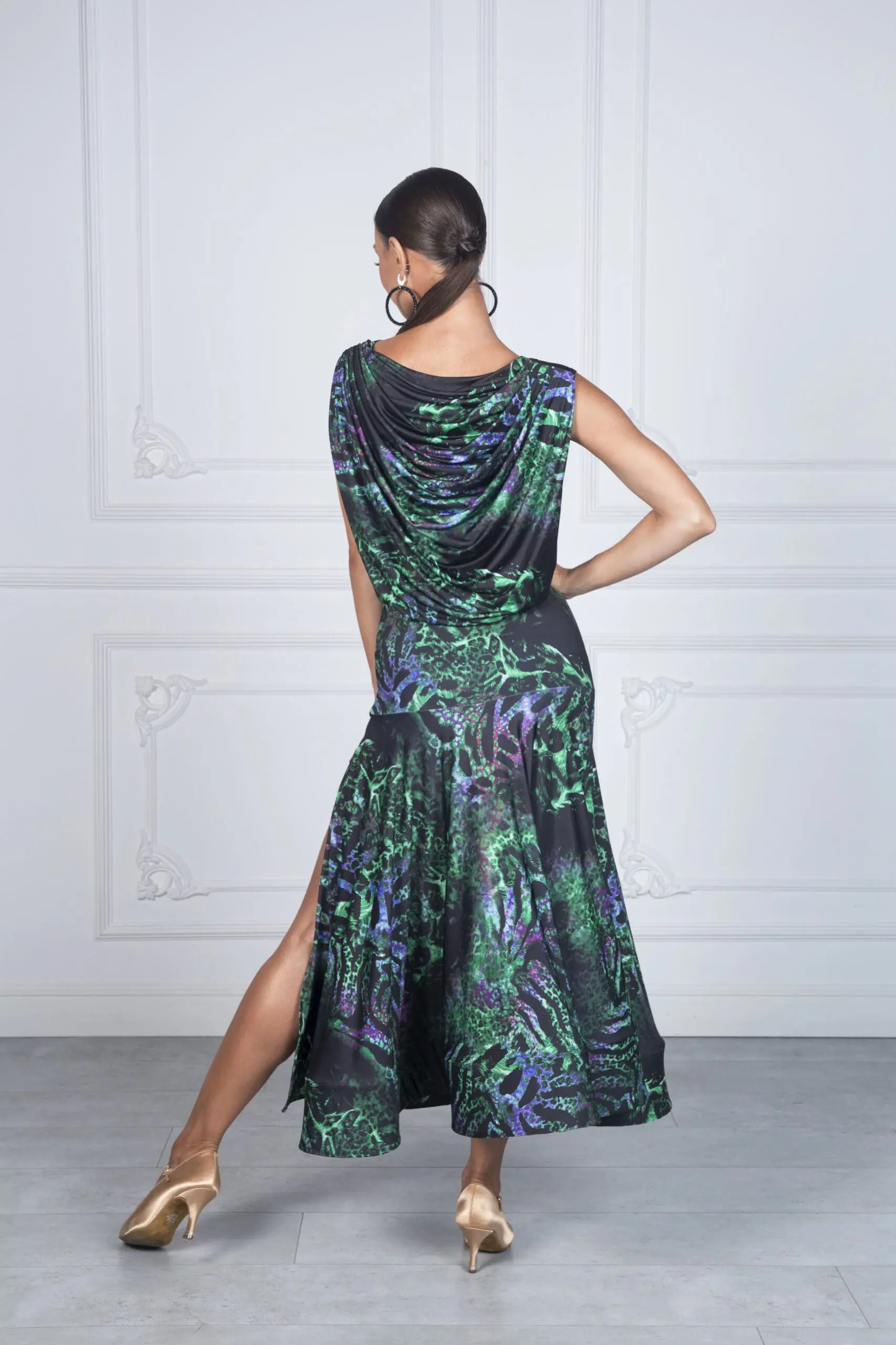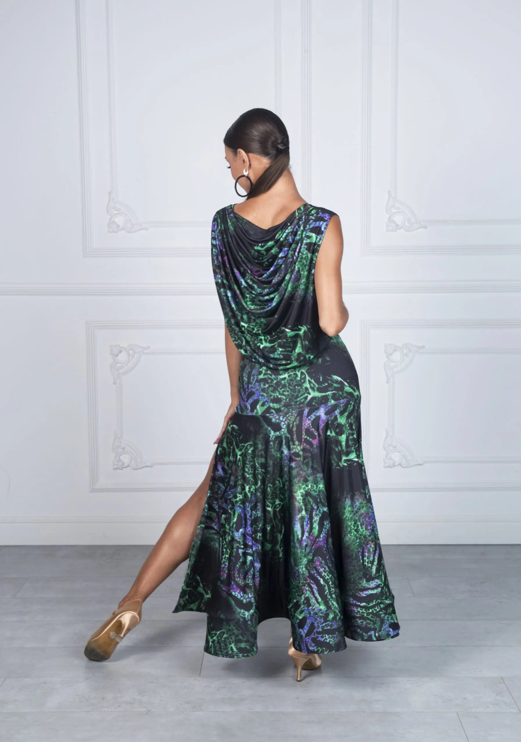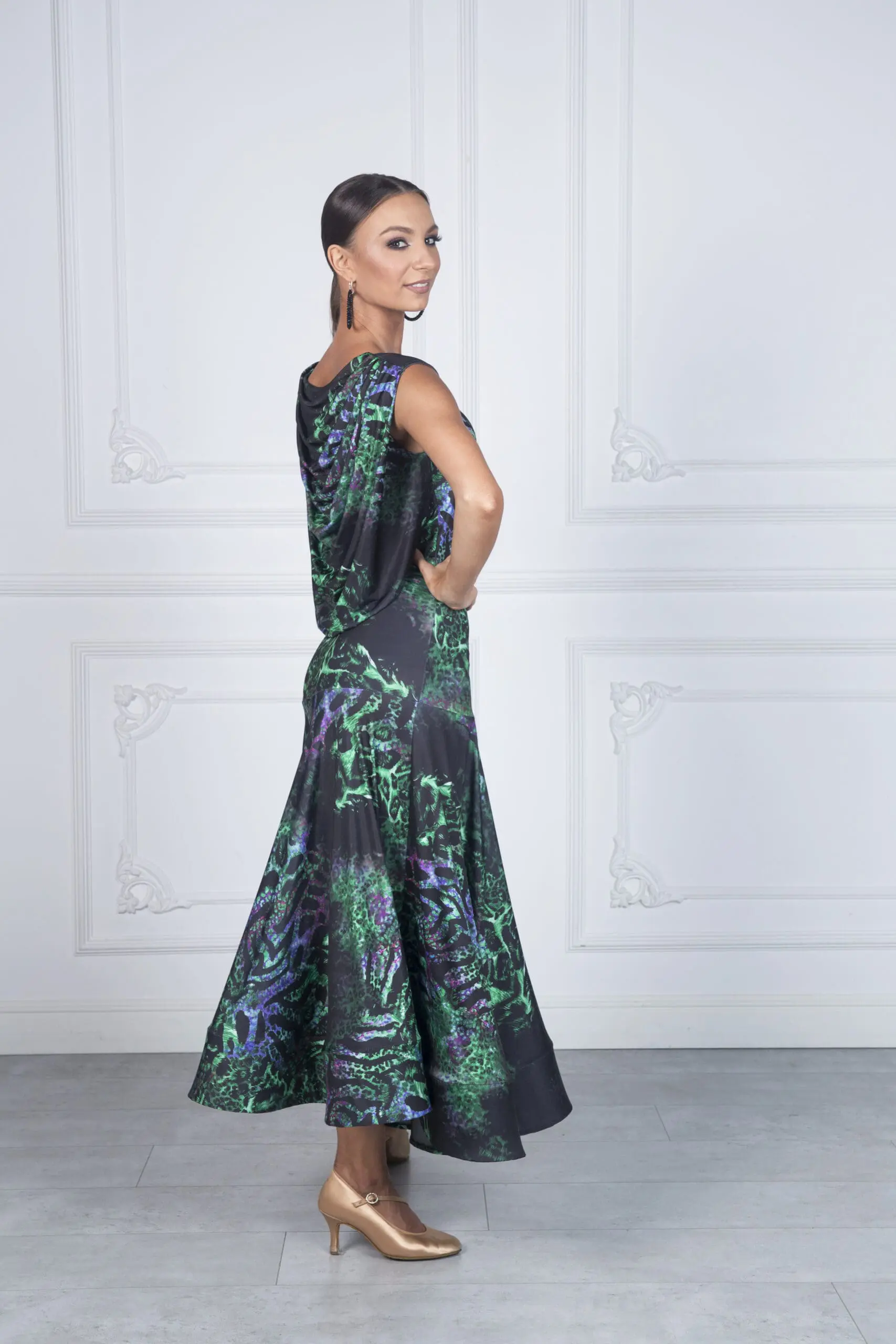 Jej najbardziej wyróżniające się elementy to przepiękny tył sukienki przypominający efekt wody – subtelny, a zarazem efektowny akcent podkreślający sylwetkę. Dół sukienki wykończony szeroką krynoliną dodaje jej lekkości i elegancji, a rozporek zapewnia swobodę ruchów i komfort podczas ćwiczeń.