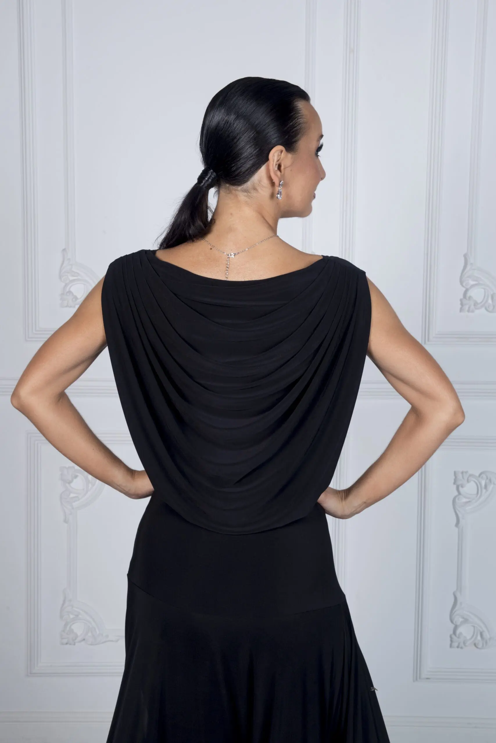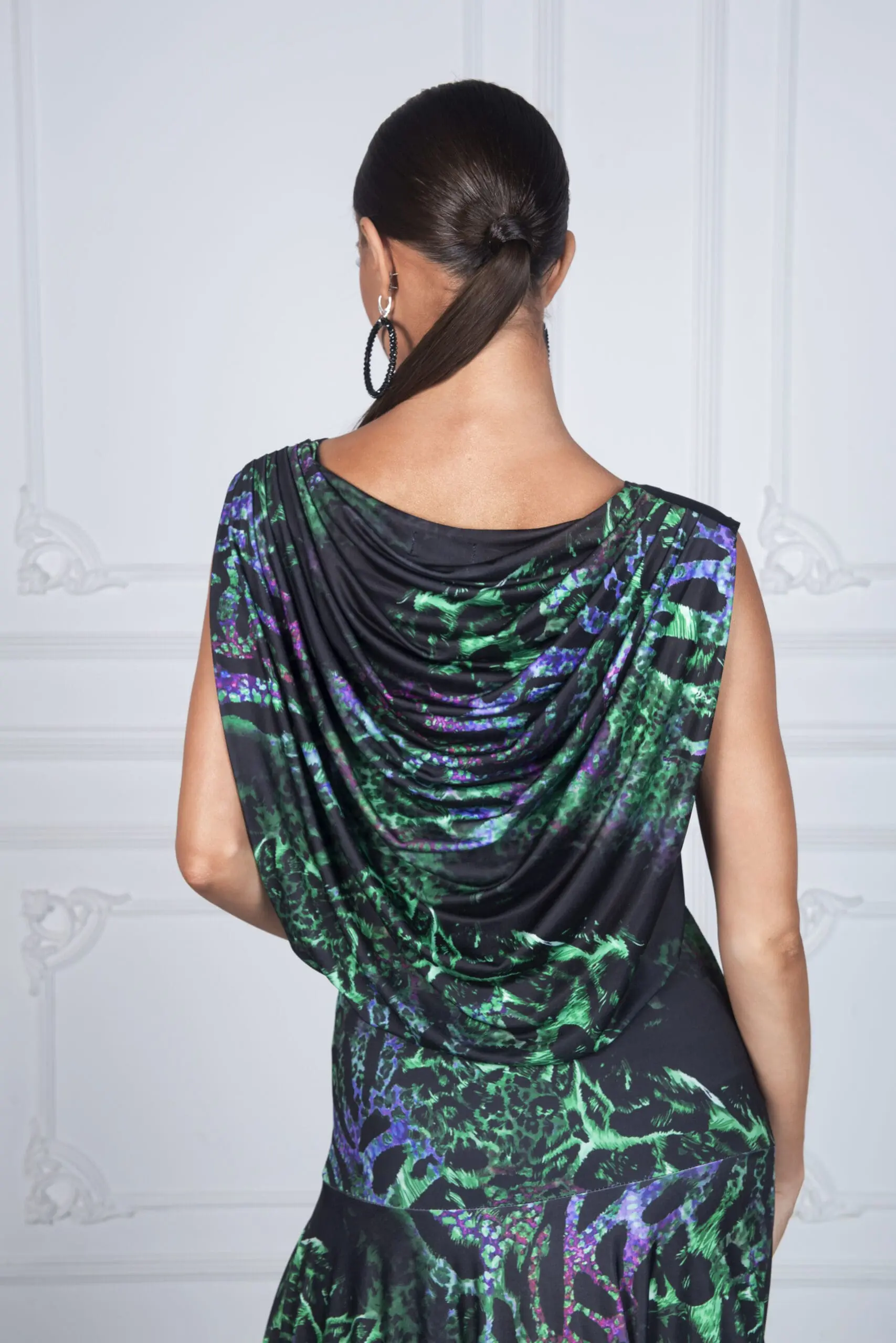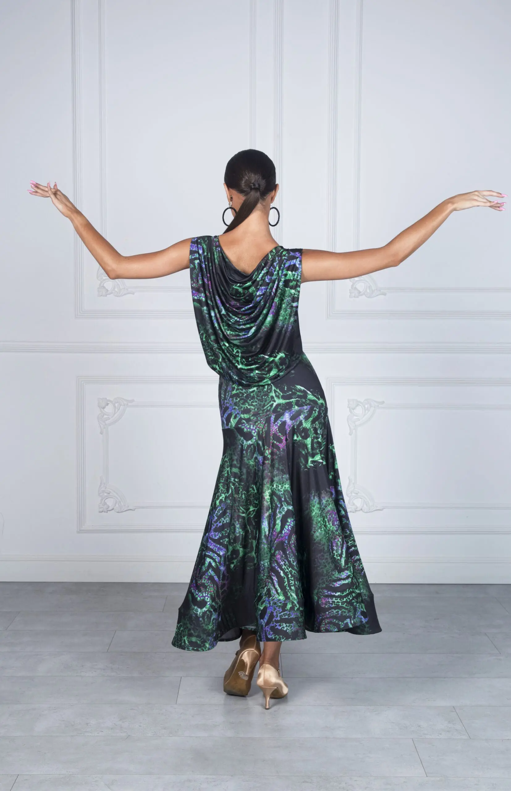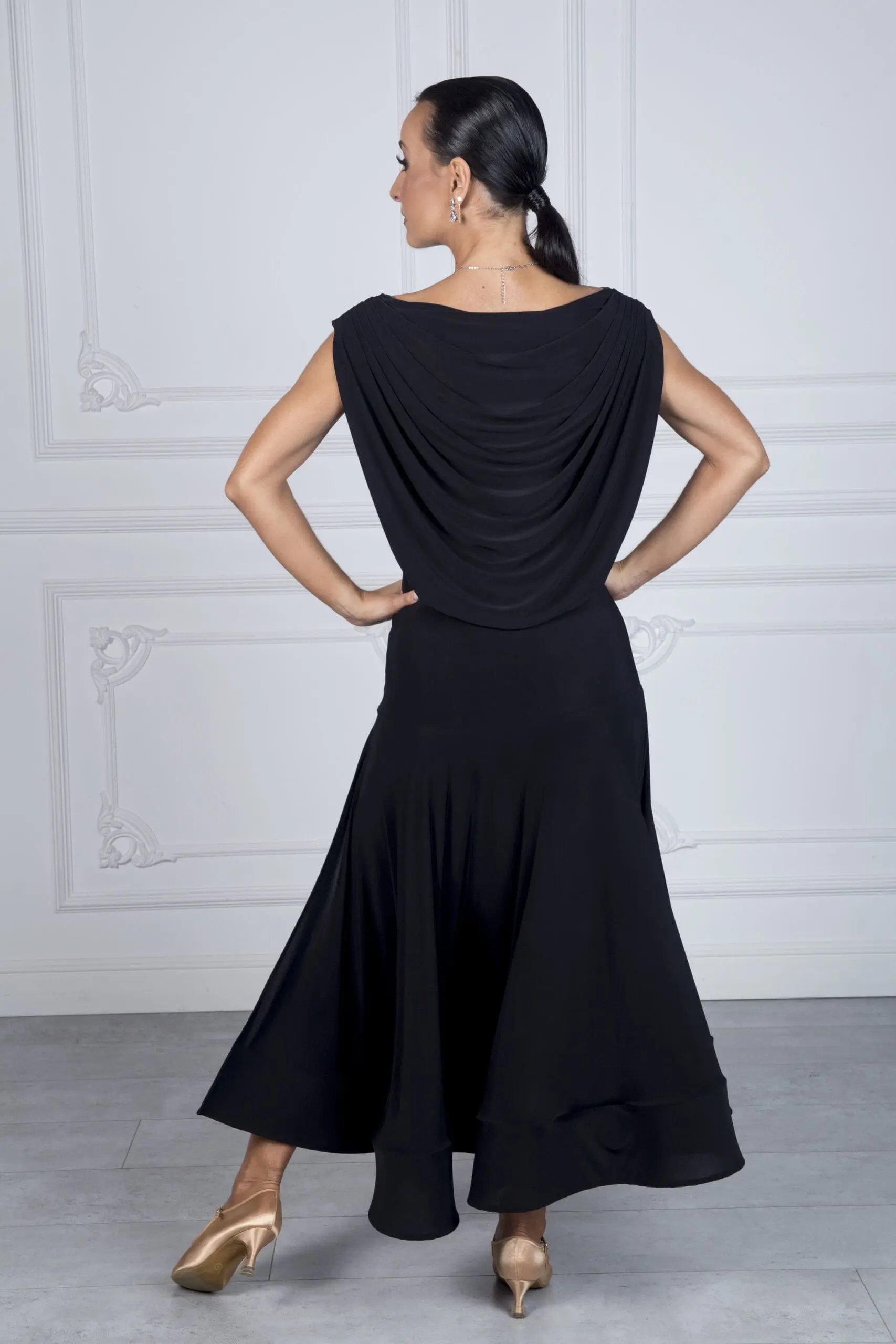 Jej najbardziej wyróżniające się elementy to przepiękny tył sukienki przypominający efekt wody – subtelny, a zarazem efektowny akcent podkreślający sylwetkę. Dół sukienki wykończony szeroką krynoliną dodaje jej lekkości i elegancji, a rozporek zapewnia swobodę ruchów i komfort podczas ćwiczeń.