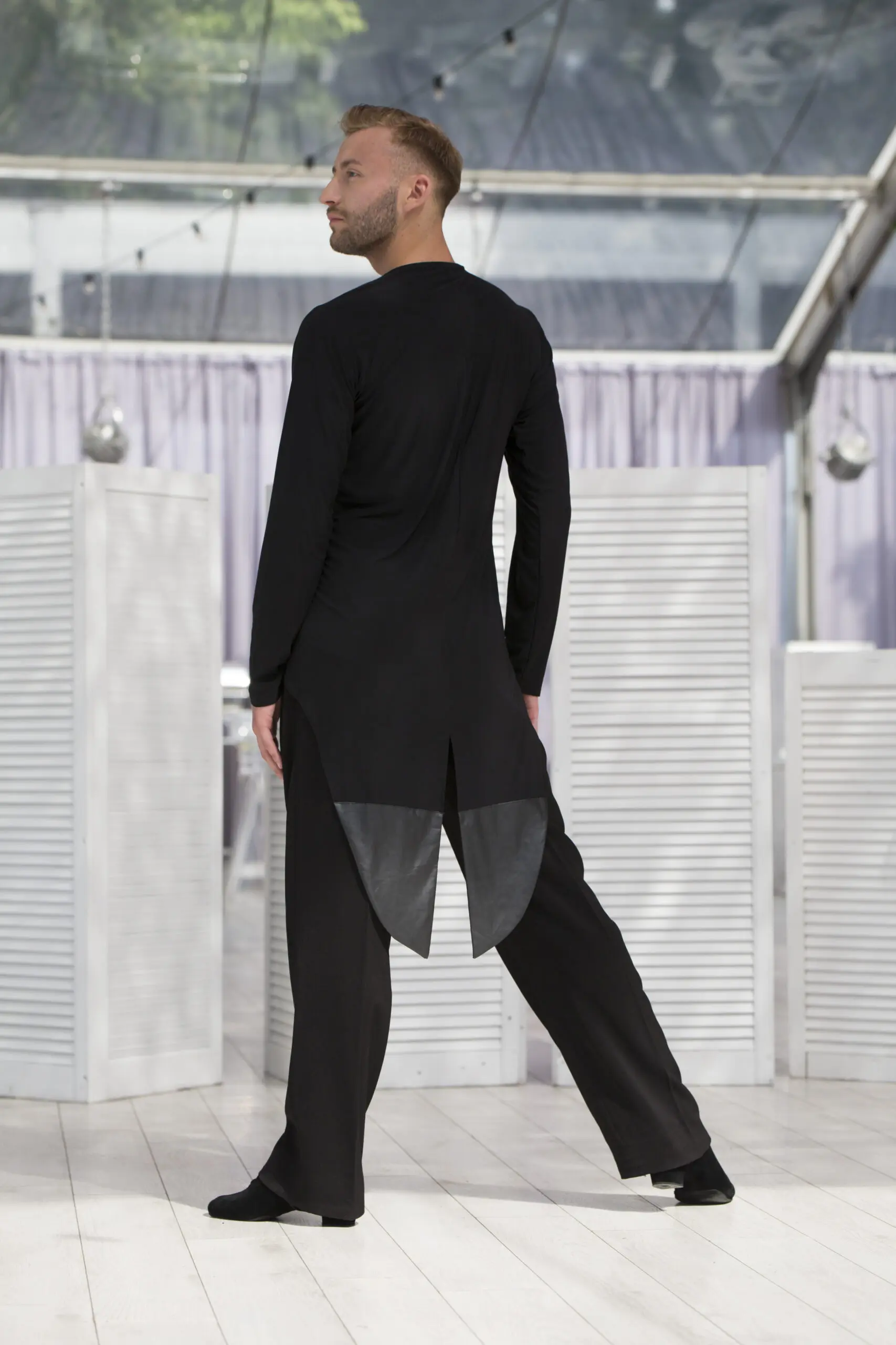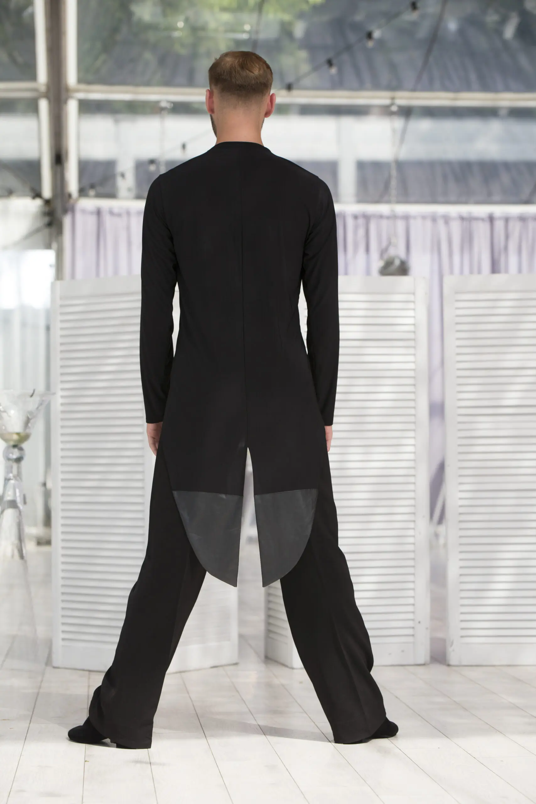 Bluzka wzorowana frakiem wykończona elementami ze skóry ekologicznej to nasza propozycja dla Panów, którzy cenią sobie elegancką swobodę oraz uwielbiają tańczyć we fraku. Dłuższy tył bluzki wykończony skórą nadaje jej zwiewności i elegancji, natomiast długi rękaw wydłuża linię rąk tancerza i nadaje mu szyku. Takiej propozycji bluzki treningowej wzorowanej frakiem nie było jeszcze na polskim rynku. Bluzka Trivor to idealna propozycja zarówno do tańców standardowych jak i latynoamerykańskich. Bestseller roku, którego nie może zabraknąć w Waszej szafie!.